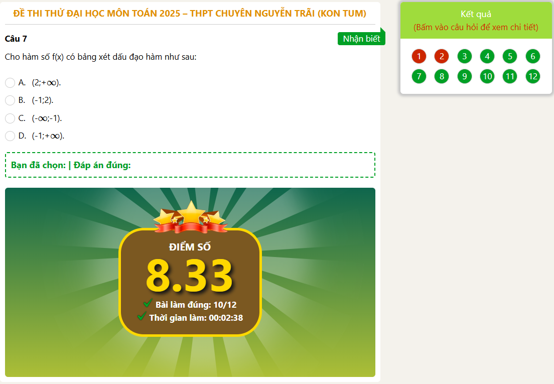 Người dùng có thể làm bài trực tiếp trên website hoặc qua ứng dụng di động. Giao diện tối ưu cho cả máy tính và điện thoại, thân thiện với mọi đối tượng sử dụng.